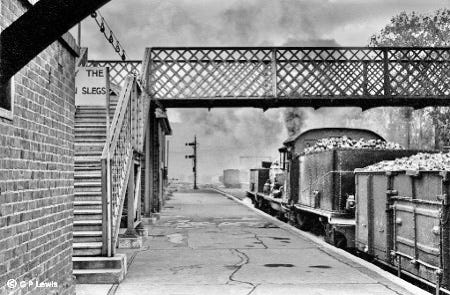 Typical pedestrian bridge at a Pretoria railway station, circa 1959. Warning sign overhead ( photo C P Lewis)